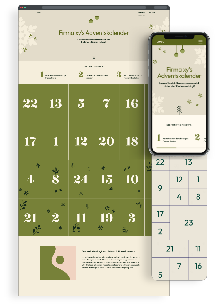 Das WordPress Adventskalender Theme bietet viele Möglichkeiten, für schöne Überraschungsmomente auf einer Website zu sorgen. Gutscheine, Rabatte, Sachgeschenke, Services, Angebote - hinter den Türchen lässt sich vieles verstecken, was Freude macht, die Kundenbindung erhöht und Weihnachtsumsätze ankurbelt.